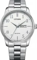 Мужские наручные часы Citizen Eco Drive BM8550-81A. Точный кварцевый механизм с аналоговой индикацией. Браслет из нержавеющей стали. Солнечная батарейка. Солнечная подзаряжающаяся батарейка обеспечивает питание часов для работы. Браслет из нержавеющей стали. Прочное, устойчивое к царапинам минеральное стекло защищает часы от повреждений. На циферблате отображается текущее число месяца и день недели. Часы являются водонепроницаемыми до 10 Бар. Цвет циферблата: Серебристый. Цвет корпуса: Белый. Толщина: 10 мм. Гарантия: 2 года.
