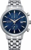Кварцевый хронограф с окошком даты. Калибр B64* оснащенный системой питания и подзарядки от солнечного света ECO-DRIVE. • Система ECO-DRIVE - патентованная технология CITIZEN заключающаяся в размещении фотоэлементов скрытых под циферблатом и постоянно подзаряжающих аккумулятор часов. Продолжительность работы после полной зарядки аккумулятора при последующем хранении в темноте - 7 месяцев. • Система предупреждения о низком уровне заряда аккумулятора за 72 часа до критического уровня. • Центральная стрелка для отсчета секунд. Счетчик накопитель на 60 минут в положении 12 часов. • Смещенная секундная стрелка в положении 6 часов. • Окошко даты. • Точность хода не хуже -/+15 сек./в месяц. • Минеральное стекло устойчивое к возникновению царапин. • Корпус из высококачественного стального сплава 316L с высокими антикоррозийными свойствами. • Водозащита до 5 АТМ. • Литой браслет из нержавеющей стали. • Надежный браслетный замок с тройным сгибом.
