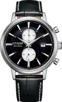 Мужские наручные часы Citizen Eco Drive CA7061-18E. Точный кварцевый механизм с аналоговой индикацией. Ремешок изготовлен из кожи. Функция хронографа. Солнечная батарейка. Солнечная подзаряжающаяся батарейка обеспечивает питание часов для работы. Браслет из нержавеющей стали. Прочное, устойчивое к царапинам минеральное стекло защищает часы от повреждений. На циферблате отображается текущее число месяца. Часы являются водонепроницаемыми до 5 Бар. Цвет циферблата: Серебристый. Цвет корпуса: Черный. Толщина: 12 мм. Гарантия: 2 года.