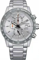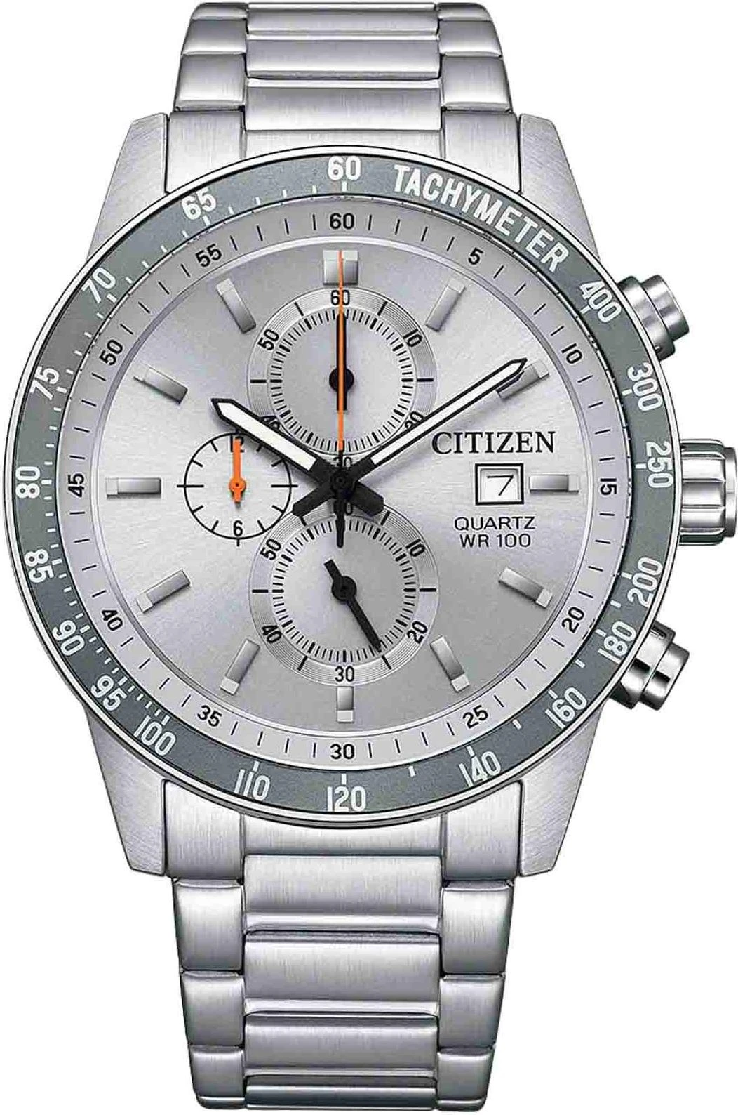 Кварцевый хронограф в стальном корпусе диаметром 44 мм со стальным браслетом. Модель с циферблатом, оснащенным штриховыми индексами и люминесцентными метками, включает функции хронографа (часы, минуты, секунды), индикацию даты и тахиметр. Устойчивое к царапинам минеральное стекло обеспечивает защиту циферблата, а водостойкость WR100 позволяет использовать часы для плавания без погружения.