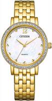 Женские кварцевые часы в корпусе и с браслетом из нержавеющей стали с золотистым покрытием. Модель с белым перламутровым циферблалом, украшенным кристаллами по ободку, оснащена центральными часовой, минутной и секундной стрелками, а также окошком даты на позиции 3 часа. Круглый корпус диаметром 31 мм и толщиной 7 мм защищен устойчивым к царапинам минеральным стеклом. Часы обладают водостойкостью WR50, обеспечивающей защиту от брызг и дождя.