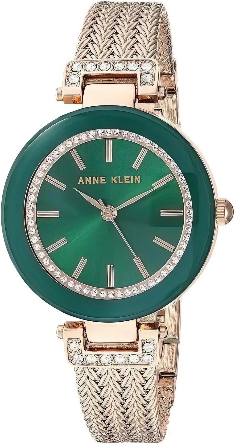 Модные наручные часы дополнят имидж элегантных женщин. Модель изготовлена в золотисто-зеленой цветовой гамме. Циферблат по кругу украшен сверкающими на солнце кристаллами Swarovski. Часовая и минутная стрелки с заостренными вершинами.