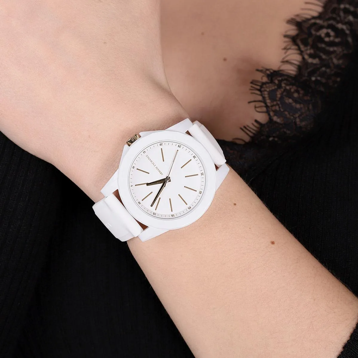 Женские наручные часы Armani Exchange Luggage AX7126. Точный кварцевый механизм с аналоговой индикацией. Полимерный корпус надежно защищает часы от механических повреждений. Полимерный ремешок. Натуральный полимерный материал является идеальным для изготовления ремешка благодаря своей чрезвычайной прочности и гибкости. Прочное, устойчивое к царапинам минеральное стекло защищает часы от повреждений.Часы являются водонепроницаемыми до 3 Бар. Цвет корпуса: Белый. Цвет циферблата: Белый. Ширина (с заводной головкой): 40мм. Толщина: 12мм. Гарантия: 2 года.