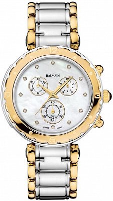 Женские часы в современном стиле. Белый перламутровый циферблат, инкрустированный 12 бриллиантами Top Wesselton VS-SI общим весом 0,070 карата, три небольших счётчика (хронограф) и бриллиантовые цифры. Двухцветный корпус из нержавеющей стали диаметром 38 мм и с PVD-покрытием цвета жёлтого золота, толщина корпуса 11 мм. Эти часы швейцарского производства оснащены сапфировым стеклом.<br />