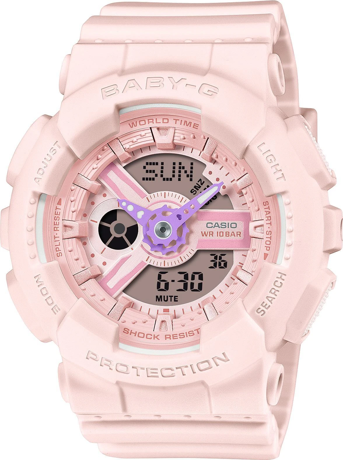 Женские кварцевые часы. Подсветка. Центральные часовая и минутная стрелки. Функция мирового времени — 29 часовых зон (48 городов). Секундомер с точностью 1/100 секунды и пределом измерения 24 часа. Таймер. 5 ежедневных будильника, один из них с функцией повтора будильника. Автоматический календарь. Ежечасный сигнал. 12/24х часовой формат времени. Включение/выключение звука кнопок. Светло-розовый циферблат. Ударопрочный круглый корпус выполнен из полимерного материала розового цвета. Размер корпуса составляет 43 х 46 х 16 мм. Розовый ремешок выполнен из полимерного материала, стандартная застежка. Прочное минеральное стекло, устойчивое к мелким механическим повреждениям. Водостойкость WR 100 (плавание без погружения).