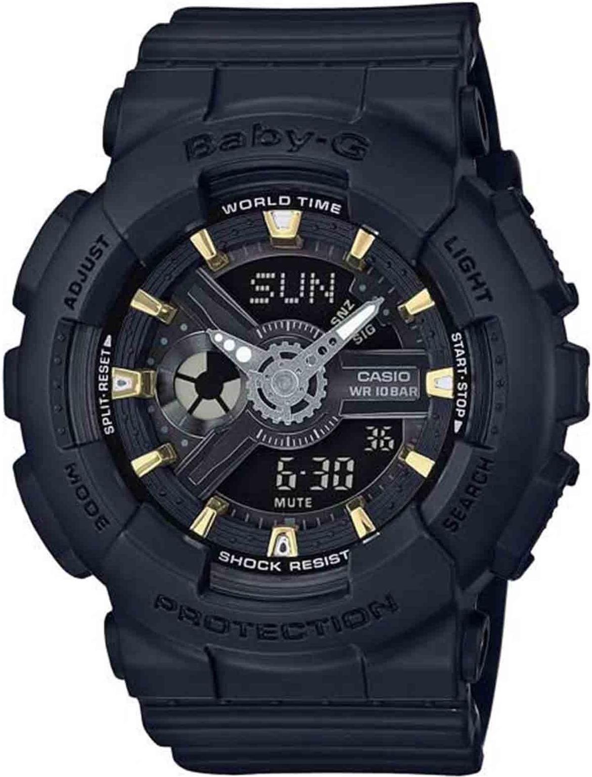 Мужские наручные часы Casio Baby-G BA-110XGA-1A. Точный кварцевый механизм с аналого-цифровой индикацией. Полимерный корпус надежно защищает часы от механических повреждений. Светодиодная подсветка. На циферблате отображается текущее число, месяц и день недели. Ударопрочная конструкция часов защищает от ударов и вибрации. Функция хронографа. Функция таймера. Таймеры обратного отсчета напомнят Вам о текущих или особенных событиях, издав звуковой сигнал в установленное время. Функция будильника. Аккумулятор обеспечивает часы достаточным питанием приблизительно на 2 года. Отображение текущего времени в основных городах и конкретных областях по всему миру. После настройки автоматический календарь всегда отображает точную дату. Отображение времени возможно в 12-часовом или 24-часовом формате. Полимерный ремешок. Натуральный полимерный материал является идеальным для изготовления ремешка благодаря своей чрезвычайной прочности и гибкости. Прочное, устойчивое к царапинам минеральное стекло защищает часы от повреждений.Часы являются водонепроницаемыми до 10 Бар. Цвет корпуса: Черный. Цвет циферблата: Черный. Ширина (с заводной головкой): 46мм. Толщина: 16мм. Гарантия: 2 года.