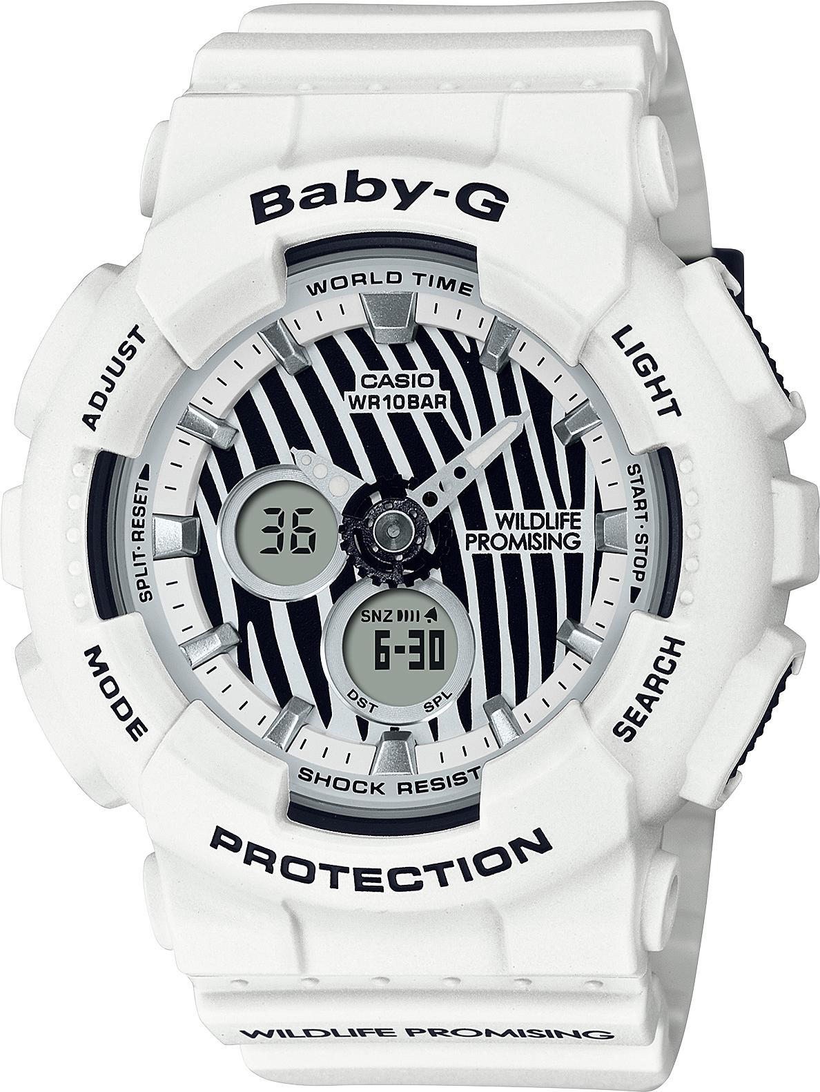 Женские наручные часы Casio Baby-G BA-120WLP-7A. Точный кварцевый механизм с аналого-цифровой индикацией. Полимерный ремешок. Натуральный полимерный материал является идеальным для изготовления ремешка благодаря своей чрезвычайной прочности и гибкости. После настройки автоматический календарь всегда отображает точную дату. Для подсветки дисплея используется светодиод, а так же имеет функцию автоматического включения подсветки, если Вы наклоните часы к своему лицу. Аккумулятор обеспечивает часы достаточным питанием приблизительно на 2 года. Функция будильника. Функция хронографа. Отображение текущего времени в основных городах и конкретных областях по всему миру. Функция таймера. Таймеры обратного отсчета напомнят Вам о текущих или особенных событиях, издав звуковой сигнал в установленное время. Ударопрочная конструкция часов защищает от ударов и вибрации. Отображение времени возможно в 12-часовом или 24-часовом формате. Полимерный ремешок. Натуральный полимерный материал является идеальным для изготовления ремешка благодаря своей чрезвычайной прочности и гибкости. Прочное, устойчивое к царапинам минеральное стекло защищает часы от повреждений. На циферблате отображается текущее число, месяц и день недели. Часы являются водонепроницаемыми до 10 Бар. Цвет циферблата: Белый. Цвет корпуса: Белый. Цвет корпуса: Черный. Светодиодная подсветка. На стрелки и отметки нанесен светонакопительный состав, благодаря этому считывать информацию с циферблата возможно и в темноте. Толщина: 16 мм. Гарантия: 2 года.