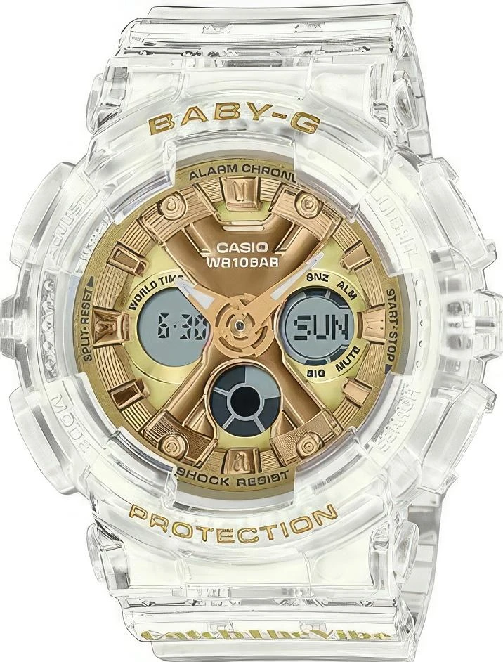 Женские наручные часы Casio Baby-G BA-130CVG-7A. Точный кварцевый механизм с аналого-цифровой индикацией. Полимерный корпус надежно защищает часы от механических повреждений. Светодиодная подсветка. На циферблате отображается текущее число, месяц и день недели. Ударопрочная конструкция часов защищает от ударов и вибрации. Функция хронографа. Функция будильника. Аккумулятор обеспечивает часы достаточным питанием приблизительно на 2 года. Отображение текущего времени в основных городах и конкретных областях по всему миру. После настройки автоматический календарь всегда отображает точную дату. Отображение времени возможно в 12-часовом или 24-часовом формате. Полимерный ремешок. Натуральный полимерный материал является идеальным для изготовления ремешка благодаря своей чрезвычайной прочности и гибкости. Прочное, устойчивое к царапинам минеральное стекло защищает часы от повреждений.Часы являются водонепроницаемыми до 10 Бар. Цвет корпуса: Белый. Цвет циферблата: Золотистый. Ширина (с заводной головкой): 46мм. Толщина: 16мм. Гарантия: 2 года.
