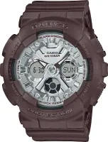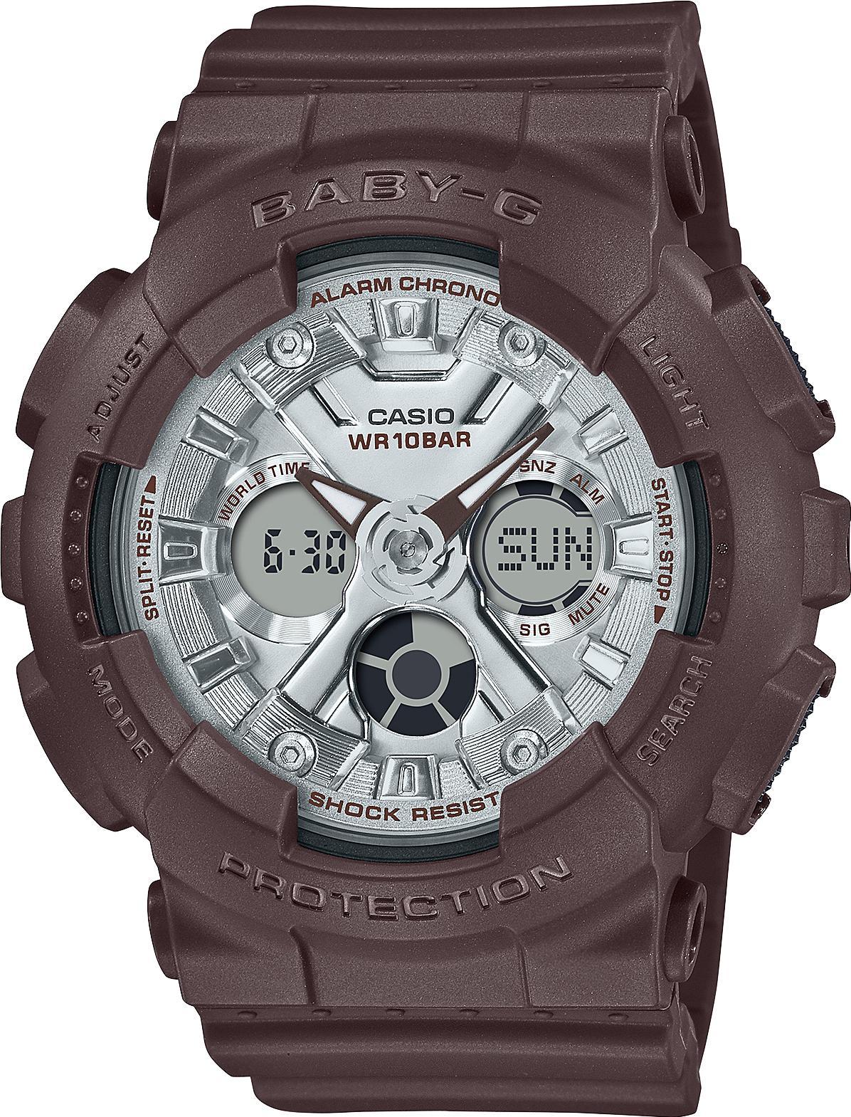 Женские наручные часы Casio Baby-G BA-130SW-5A. Точный кварцевый механизм с аналого-цифровой индикацией. Полимерный ремешок. Натуральный полимерный материал является идеальным для изготовления ремешка благодаря своей чрезвычайной прочности и гибкости. После настройки автоматический календарь всегда отображает точную дату. Аккумулятор обеспечивает часы достаточным питанием приблизительно на 2 года. Функция будильника. Функция хронографа. Отображение текущего времени в основных городах и конкретных областях по всему миру. Функция таймера. Таймеры обратного отсчета напомнят Вам о текущих или особенных событиях, издав звуковой сигнал в установленное время. Ударопрочная конструкция часов защищает от ударов и вибрации. Отображение времени возможно в 12-часовом или 24-часовом формате. Полимерный ремешок. Натуральный полимерный материал является идеальным для изготовления ремешка благодаря своей чрезвычайной прочности и гибкости. Прочное, устойчивое к царапинам минеральное стекло защищает часы от повреждений. На циферблате отображается текущее число, месяц и день недели. Часы являются водонепроницаемыми до 10 Бар. Цвет циферблата: Коричневый. Цвет корпуса: Серый. Цвет корпуса: Серебристый. Светодиодная подсветка. На стрелки и отметки нанесен светонакопительный состав, благодаря этому считывать информацию с циферблата возможно и в темноте. Толщина: 16 мм. Гарантия: 2 года.