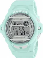 Cтильные цифровые женские часы BABY-G из серии BG-169. Без сомнения эти мятные бэбики украсят любое, даже самое изящное женское запястье. Противоударный корпус защищает механизм от ударов и вибрации. Электролюминесцентная подсветка обеспечивает равномерное освещение всего циферблата, облегчая считывание данных. Послесвечение. Цвет подсветки: белый. 12-ти и 24-х часовой формат времени. Секундомер с точностью показаний 1/100с и временем измерения 24ч. SPLIT-хронограф. Таймер обратного отсчета от 1мин до 24ч. Мировое время – 30 городов (29 часовых поясов). Автоматический переход на зимнее и летнее время, возможность включения/отключения данной функции. Счетчик дней - отображает число дней между текущей и какой-либо другой датой. Записная книжка на 25 ячеек памяти для записи телефонных номеров и дополнительных данных о владельцах, каждая запись может включать в себя текст из 8 букв и 12 цифр. Функция включения/отключения звука. Стальной безель. Батарея рассчитана на 3 года. Стальная задняя крышка крепится на 4-х винтах. Ремешок с классической застежкой.