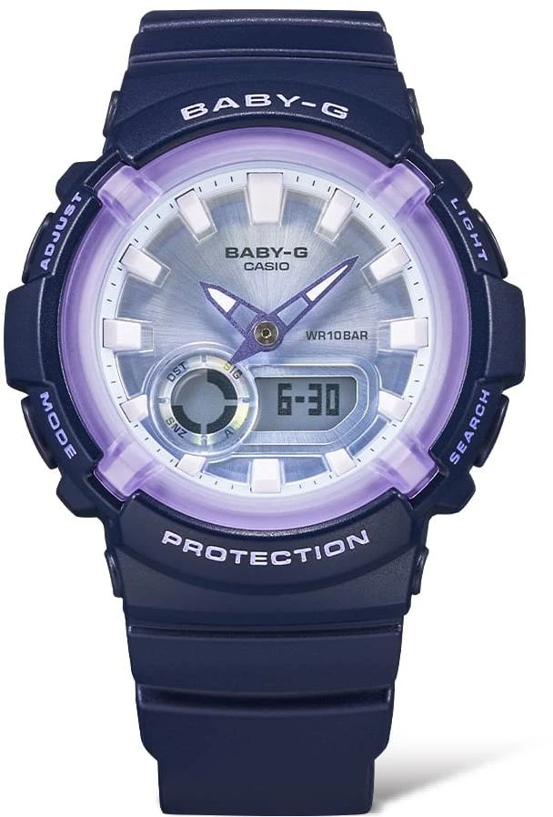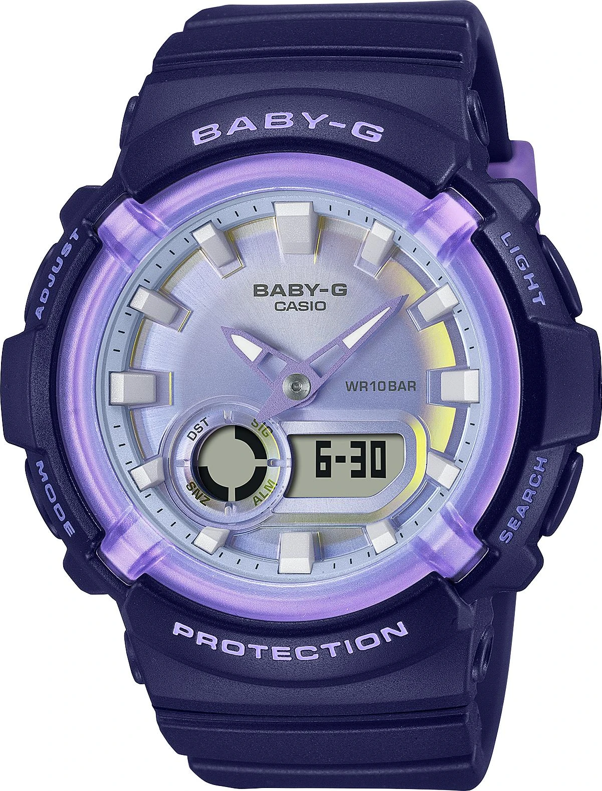 Женские наручные часы Casio Baby-G BGA-280DR-2A. Точный кварцевый механизм с аналого-цифровой индикацией. Полимерный ремешок. Натуральный полимерный материал является идеальным для изготовления ремешка благодаря своей чрезвычайной прочности и гибкости. Отображение текущего времени в основных городах и конкретных областях по всему миру. Функция будильника. Функция хронографа. После настройки автоматический календарь всегда отображает точную дату. Отображение времени возможно в 12-часовом или 24-часовом формате. Аккумулятор обеспечивает часы достаточным питанием приблизительно на 3 года. Полимерный ремешок. Натуральный полимерный материал является идеальным для изготовления ремешка благодаря своей чрезвычайной прочности и гибкости. Прочное, устойчивое к царапинам минеральное стекло защищает часы от повреждений. На циферблате отображается текущее число, месяц и день недели. Часы являются водонепроницаемыми до 10 Бар. Цвет циферблата: Фиолетовый. Цвет корпуса: Белый. Светодиодная подсветка. На стрелки и отметки нанесен светонакопительный состав, благодаря этому считывать информацию с циферблата возможно и в темноте. Толщина: 15 мм. Гарантия: 2 года.