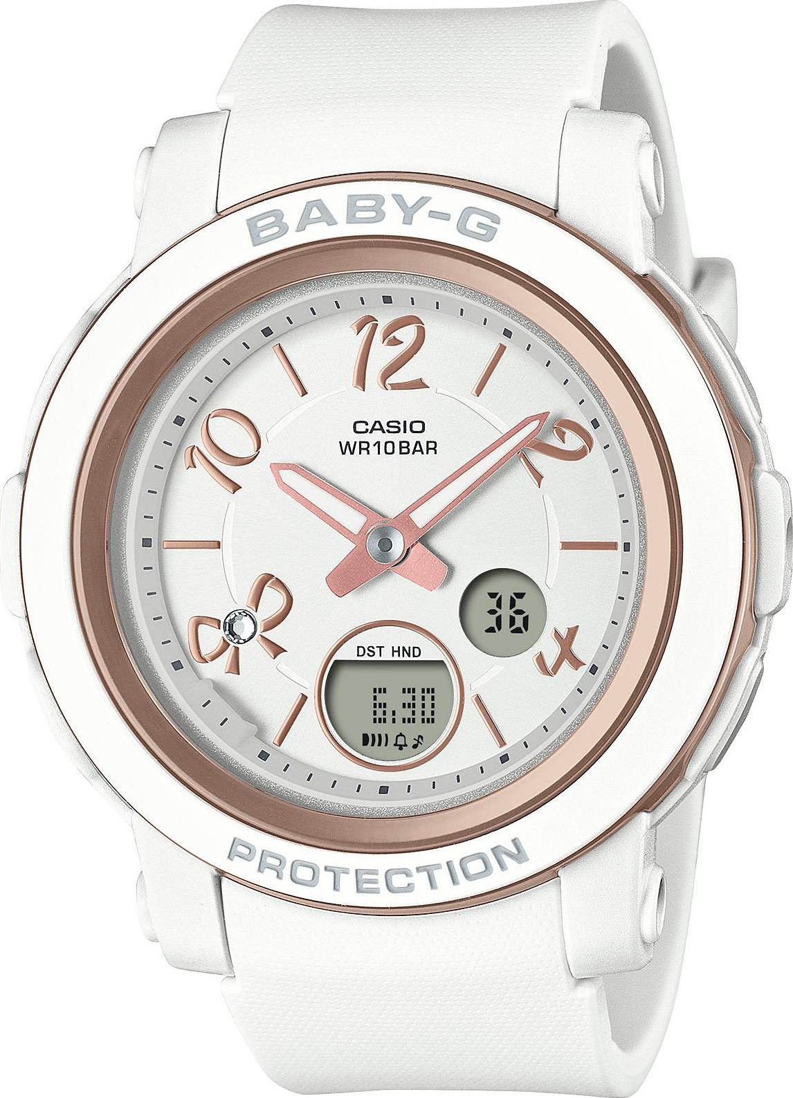 Женские наручные часы Casio Baby-G BGA-290RA-7A. Точный кварцевый механизм с аналого-цифровой индикацией. Полимерный ремешок. Натуральный полимерный материал является идеальным для изготовления ремешка благодаря своей чрезвычайной прочности и гибкости. После настройки автоматический календарь всегда отображает точную дату. Аккумулятор обеспечивает часы достаточным питанием приблизительно на 3 года. Функция будильника. Ежечасный сигнал. Функция хронографа. Отображение текущего времени в основных городах и конкретных областях по всему миру. Функция таймера. Таймеры обратного отсчета напомнят Вам о текущих или особенных событиях, издав звуковой сигнал в установленное время. Ударопрочная конструкция часов защищает от ударов и вибрации. Отображение времени возможно в 12-часовом или 24-часовом формате. Полимерный ремешок. Натуральный полимерный материал является идеальным для изготовления ремешка благодаря своей чрезвычайной прочности и гибкости. Прочное, устойчивое к царапинам минеральное стекло защищает часы от повреждений. На циферблате отображается текущее число, месяц и день недели. Часы являются водонепроницаемыми до 10 Бар. Цвет циферблата: Белый. Цвет циферблата: Розовое золото. Цвет корпуса: Белый. Светодиодная подсветка. Высота (с ушками): 45 мм. Толщина: 10 мм. Гарантия: 2 года.