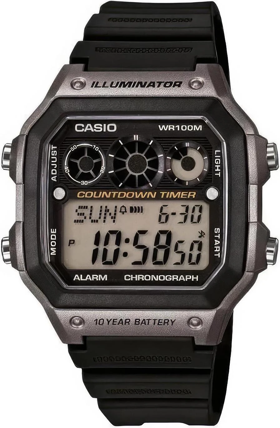 • Электрическая подсветка - для освещения циферблата используется светодиод. • Отображение текущего времени в основных городах и регионах мира. • Секундомер с точностью показаний 1/10 сек и максимальным временем измерения - 1 час. • Таймер с функцией автоповтора. • Ежедневный будильник со звуковым сигналом. • Автоматический календарь. • Срок службы батареи 10 лет. • Точность хода: не хуже +/-30 секунд в месяц. • Ремешок из полимерного материала. • Размеры корпуса 45.0 мм (по оси заводной головки) х 42.1 мм (по вертикали) х 12.5 мм (толщина) / 40 грамм.