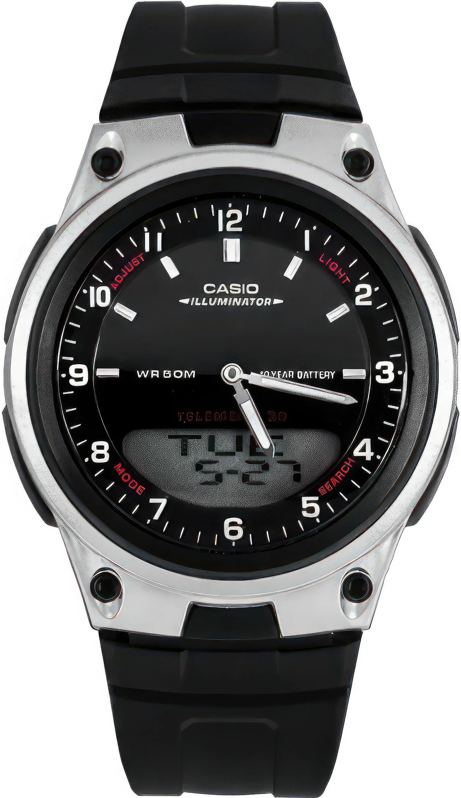 Аналогово-цифровые часы. Электрическая (светодиодная) подсветка цифрового дисплея. Записная книжка на 30 телефонных номеров. Функция мирового времени. Секундомер с точность до 1/100 сек. и запасом на 24 часа. Таймер с автоповтором. 3 будильника. Функция SNOOZE. 10-летний срок службы батареи. Автоматический календарь. Светонакопительные элементы (необрит) обеспечивают длительное послесвечение даже после кратковременного нахождения на свету. Прочное стекло со сферической поверхностью. Точность хода +/- 30 секунд в месяц.
