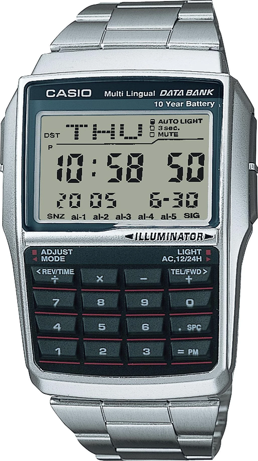 • Электрическая светодиодная подсветка с функцией автоматической подсветки при наклоне часов к лицу. • Записная телефонная книжка для хранения фамилий и номеров телефонов. Максимальная емкость - 25 абонентов. • Одновременное отображение текущего времени в двух разных часовых поясах. • Встроенный 8-ми разрядный калькулятор. Конвертер валют. • Секундомер с точностью показаний 1/100 сек и максимальным временем измерения - 24 час. • 5 программируемых будильников на ежедневный сигнал (только время) и сигнал на определенное время в определенный день (месяц, день и время). • Функция повтора сигнала будильника (Snooze). • Срок службы батареи 10 лет. • Автоматический календарь. • Стекло имеет сферическую поверхность. • Браслет из нержавеющей стали. • Надежный браслетный замок с тройным сгибом.