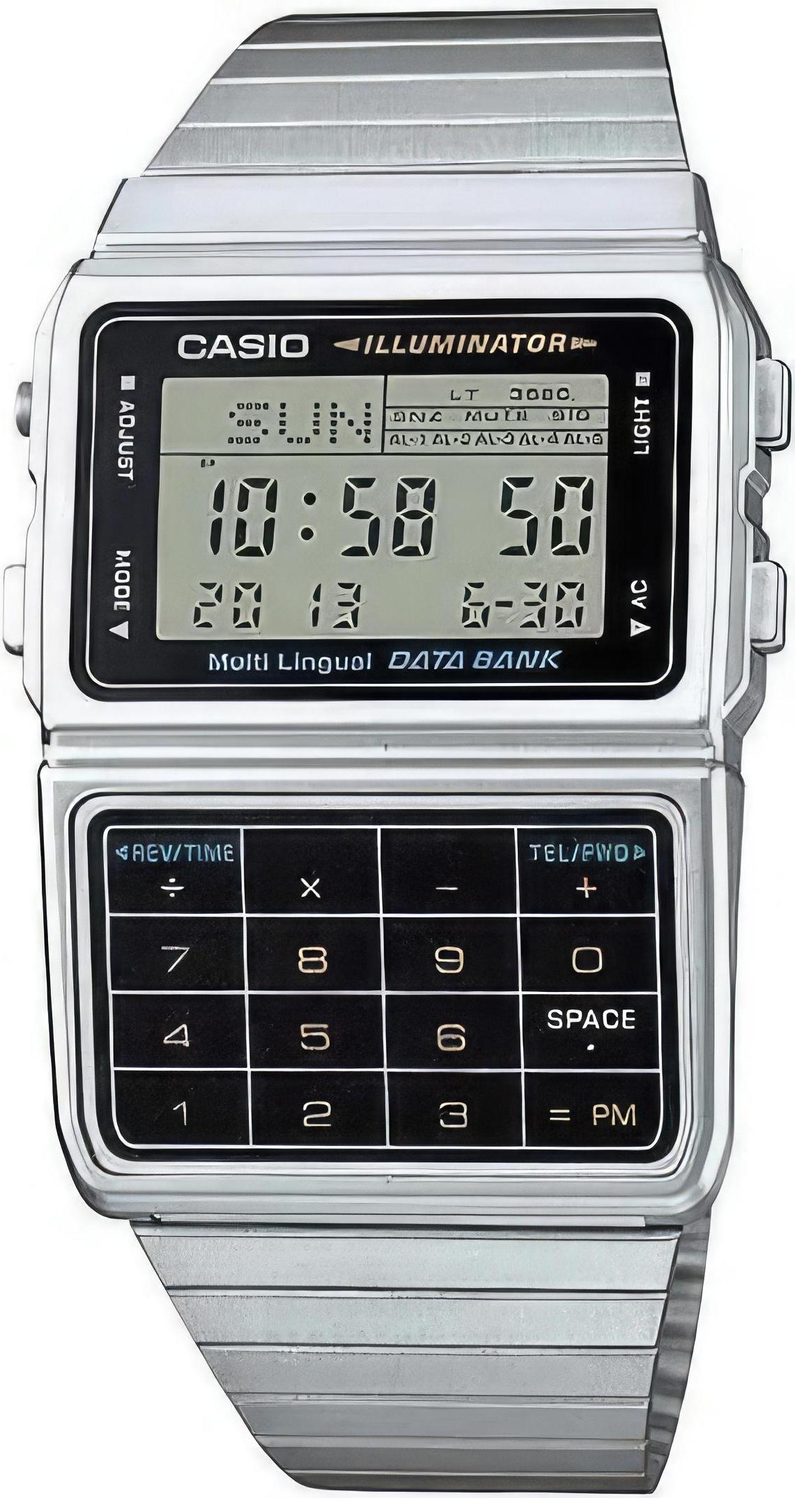 Наручные часы с встроенным калькулятором. Ретро-дизайн. Пластиковый корпус с хромированием и браслет из нерж. стали. Многофункциональный кварцевый механизм с цифровой индикацией, памятью на 25 телефонных номеров и LED подсветкой.
