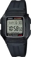 Мужские наручные электронные часы в пластковом корпусе прямоугольной формы, оснащены будильником и секундомером, на черном резиновом ремешке.