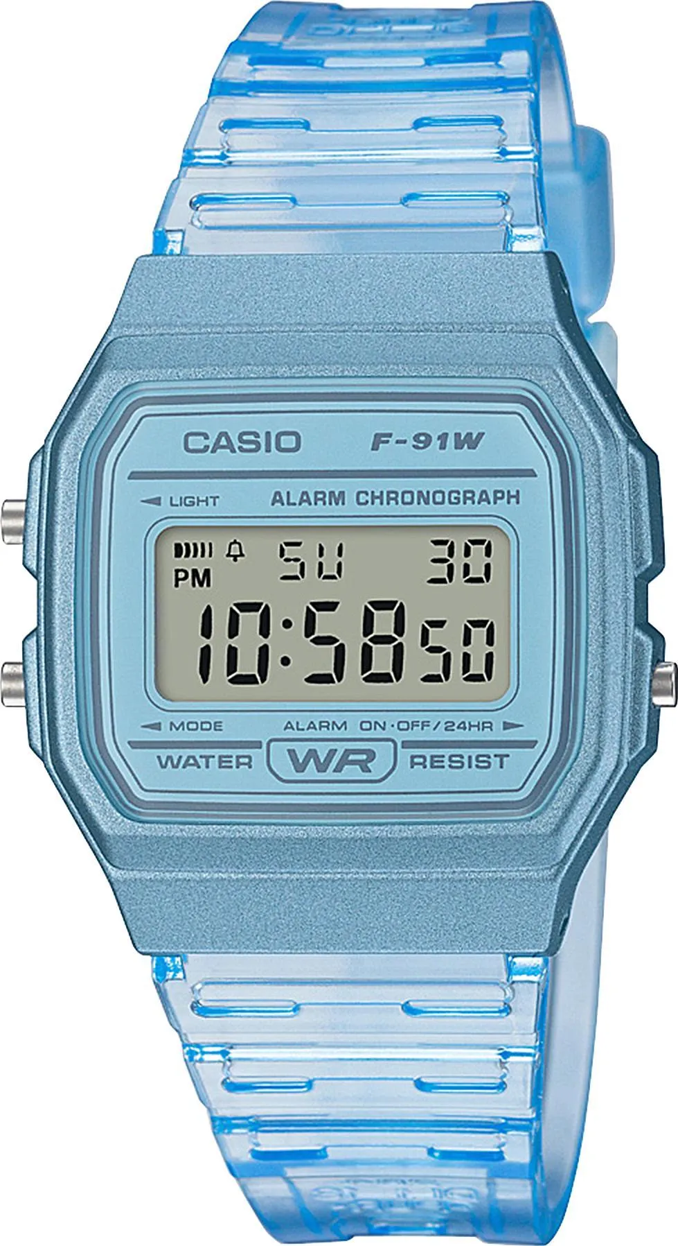 Яркие, полупрозрачные пластиковые часы водонепроницаемы, а их аккумулятор обеспечивает часы достаточным питанием приблизительно на семь лет.