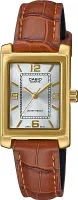 Женские наручные часы в прямоугольном корпусе с позолотой, секундная стрелка центральная, на коричневом кожаном ремешке.