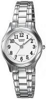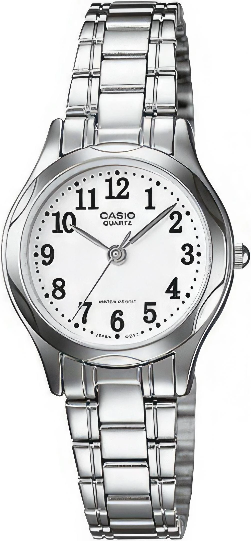 Женские наручные часы с легкочитаемым белым циферблатом с арабскими цифрами, на стальном браслете.