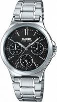Женские наручные часы в стальном круглом корпусе, секундная стрелка центральная на черном циферблате, окошко даты в положении 3 часа. На стальном браслете.