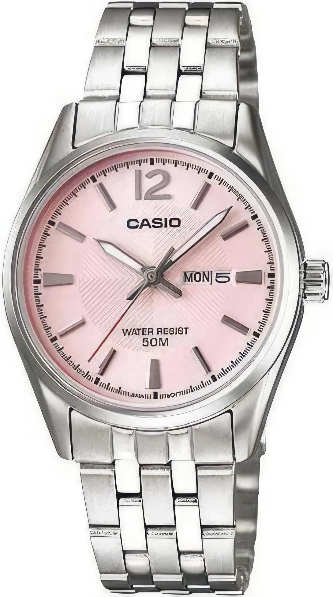 Женские наручные часы Casio Collection LTP-1335D-5A. Точный кварцевый механизм с аналоговой индикацией. Корпус изготовлен из высококачественной нержавеющей стали 316L с высокими антикоррозийными свойствами. На стрелки и отметки нанесен светонакопительный состав, благодаря этому считывать информацию с циферблата возможно и в темноте. На циферблате отображается текущее число месяца и день недели. Браслет из нержавеющей стали. Прочное, устойчивое к царапинам минеральное стекло защищает часы от повреждений. Часы являются водонепроницаемыми до 5 Бар. Цвет корпуса: Серебристый. Цвет циферблата: Розовый. Ширина (с заводной головкой): 30мм. Толщина: 9мм. Гарантия: 2 года.