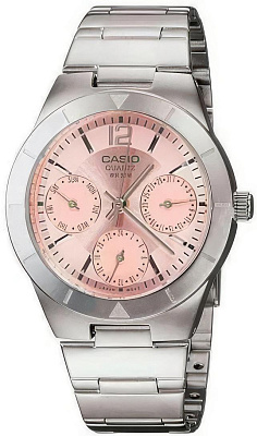 Женские кварцевые наручные часы в стальном корпусе на литом браслете. Циферблат розового оттенка с тремя дополнительными счетчиками.