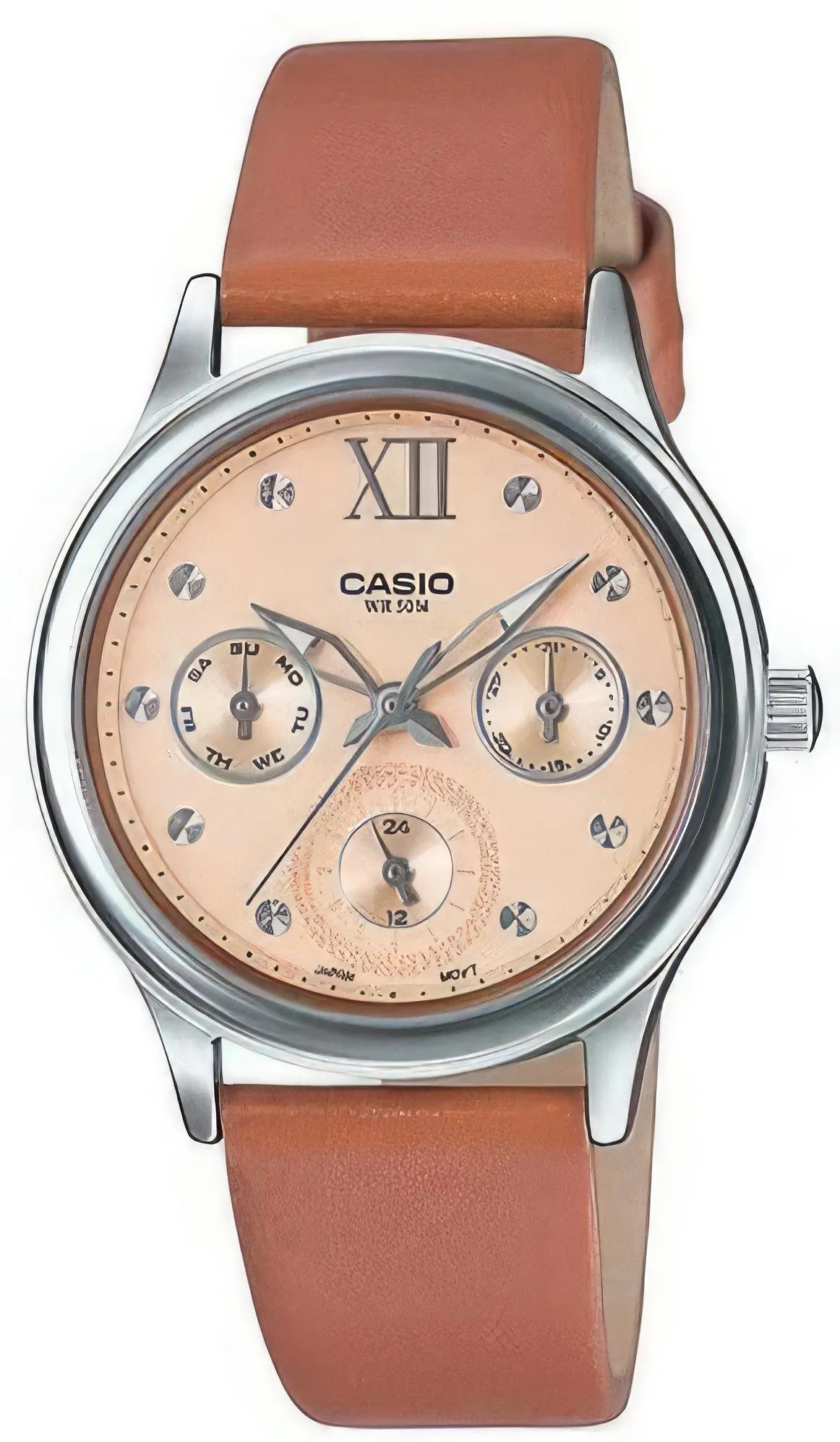 Женские наручные часы Casio Collection LTP-E306L-5A. Точный кварцевый механизм с аналоговой индикацией. Корпус изготовлен из высококачественной нержавеющей стали 316L с высокими антикоррозийными свойствами. На стрелки и отметки нанесен светонакопительный состав, благодаря этому считывать информацию с циферблата возможно и в темноте. На циферблате отображается текущее число месяца и день недели. Ремешок изготовлен из кожи. Прочное, устойчивое к царапинам минеральное стекло защищает часы от повреждений. Часы являются водонепроницаемыми до 5 Бар. Цвет циферблата: Бежевый. Ширина (с заводной головкой): 38мм. Толщина: 9мм. Гарантия: 2 года.