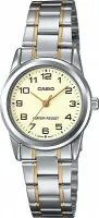 Женские наручные часы в стальном круглом корпусе, секундная стрелка центральная на светлом циферблате. Браслет стальной с частичной позолотой.