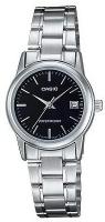 Стальные женские наручные часы в круглом корпусе с центральной секундной стрелкой и окошком даты на черном циферблате.