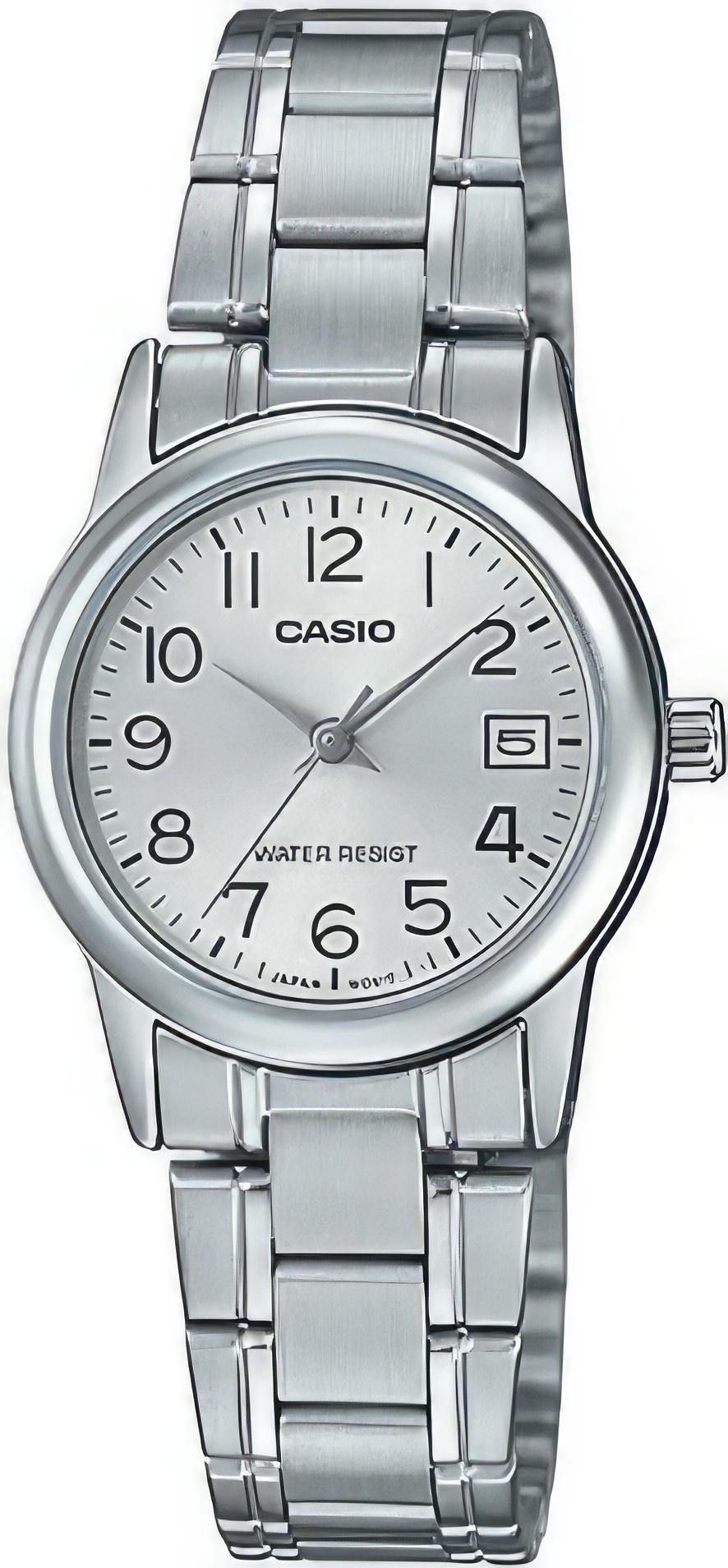 Женские наручные часы Casio Collection LTP-V002D-7B. Точный кварцевый механизм с аналоговой индикацией. Корпус изготовлен из высококачественной нержавеющей стали 316L с высокими антикоррозийными свойствами. На циферблате отображается текущее число месяца. Браслет из нержавеющей стали. Прочное, устойчивое к царапинам минеральное стекло защищает часы от повреждений. Часы являются водонепроницаемыми до 3 Бар. Цвет корпуса: Серебристый. Цвет циферблата: Серый. Ширина (с заводной головкой): 25мм. Толщина: 9мм. Гарантия: 2 года.