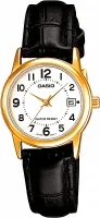 Женские наручные часы в круглом корпусе с позолотой, окошко даты в положении 3 часа, секундная стрелка центральная на белом циферблате, ремешок кожаный черного цвета.