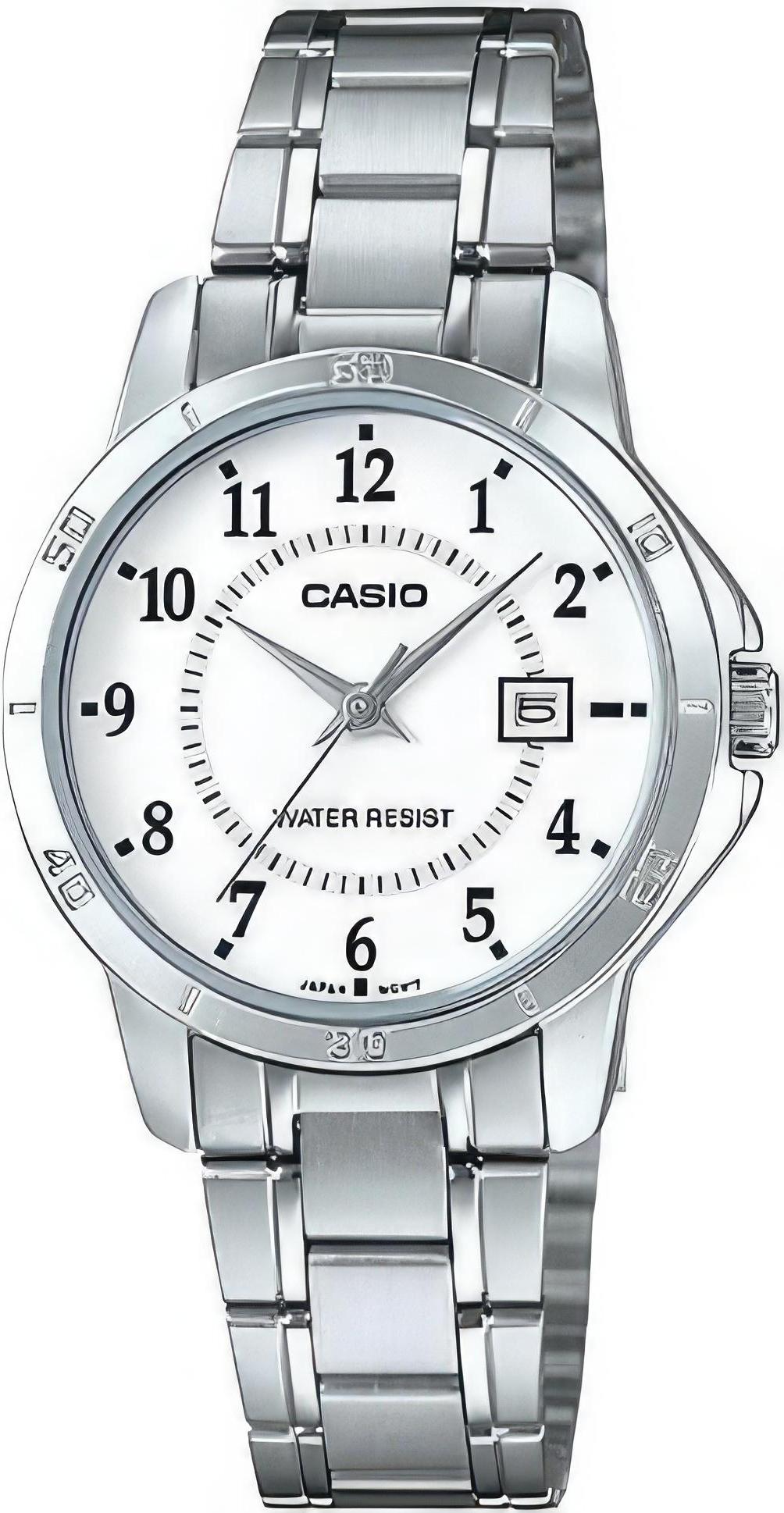 Женские наручные часы Casio Collection LTP-V004D-7B. Точный кварцевый механизм с аналоговой индикацией. Корпус изготовлен из высококачественной нержавеющей стали 316L с высокими антикоррозийными свойствами. На циферблате отображается текущее число месяца. Браслет из нержавеющей стали. Прочное, устойчивое к царапинам минеральное стекло защищает часы от повреждений. Часы являются водонепроницаемыми до 3 Бар. Цвет корпуса: Серебристый. Цвет циферблата: Белый. Ширина (с заводной головкой): 30мм. Толщина: 8мм. Гарантия: 2 года.