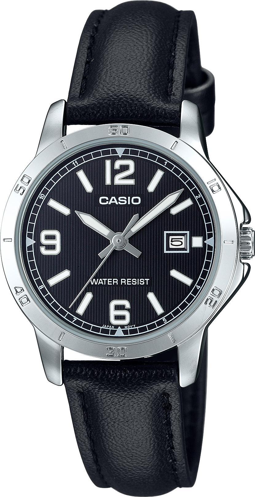 Женские наручные часы Casio Collection LTP-V004L-1B. Точный кварцевый механизм с аналоговой индикацией. Корпус изготовлен из высококачественной нержавеющей стали 316L с высокими антикоррозийными свойствами. На стрелки и отметки нанесен светонакопительный состав, благодаря этому считывать информацию с циферблата возможно и в темноте. На циферблате отображается текущее число месяца. Ремешок изготовлен из кожи. Прочное, устойчивое к царапинам минеральное стекло защищает часы от повреждений. Часы являются водонепроницаемыми до 3 Бар. Цвет корпуса: Серебристый. Цвет циферблата: Черный. Ширина (с заводной головкой): 30 мм. Толщина: 8 мм. Гарантия: 2 года.