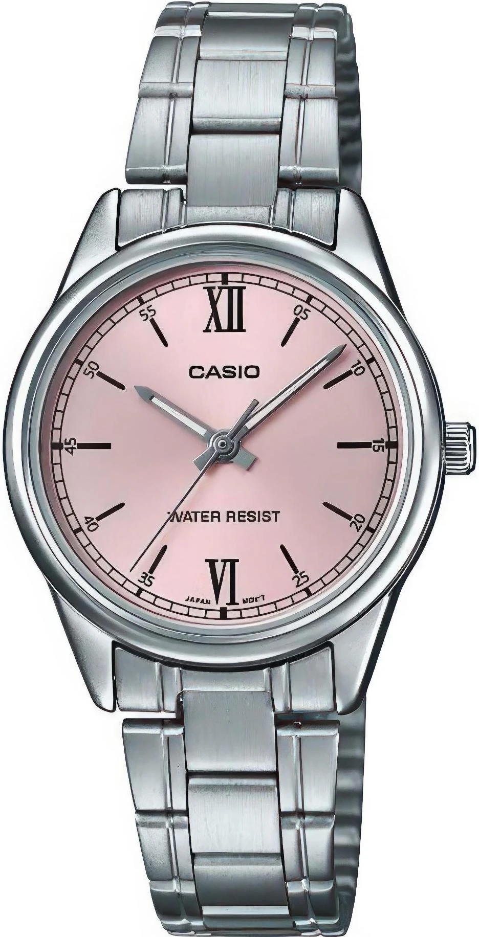 Женские наручные часы Casio Collection LTP-V005D-4B2. Точный кварцевый механизм с аналоговой индикацией. Корпус изготовлен из высококачественной нержавеющей стали 316L с высокими антикоррозийными свойствами. На стрелки и отметки нанесен светонакопительный состав, благодаря этому считывать информацию с циферблата возможно и в темноте. Браслет из нержавеющей стали. Прочное, устойчивое к царапинам минеральное стекло защищает часы от повреждений. Часы являются водонепроницаемыми до 3 Бар. Цвет корпуса: Серебристый. Цвет циферблата: Розовый. Ширина (с заводной головкой): 28мм. Толщина: 7мм. Гарантия: 2 года.