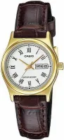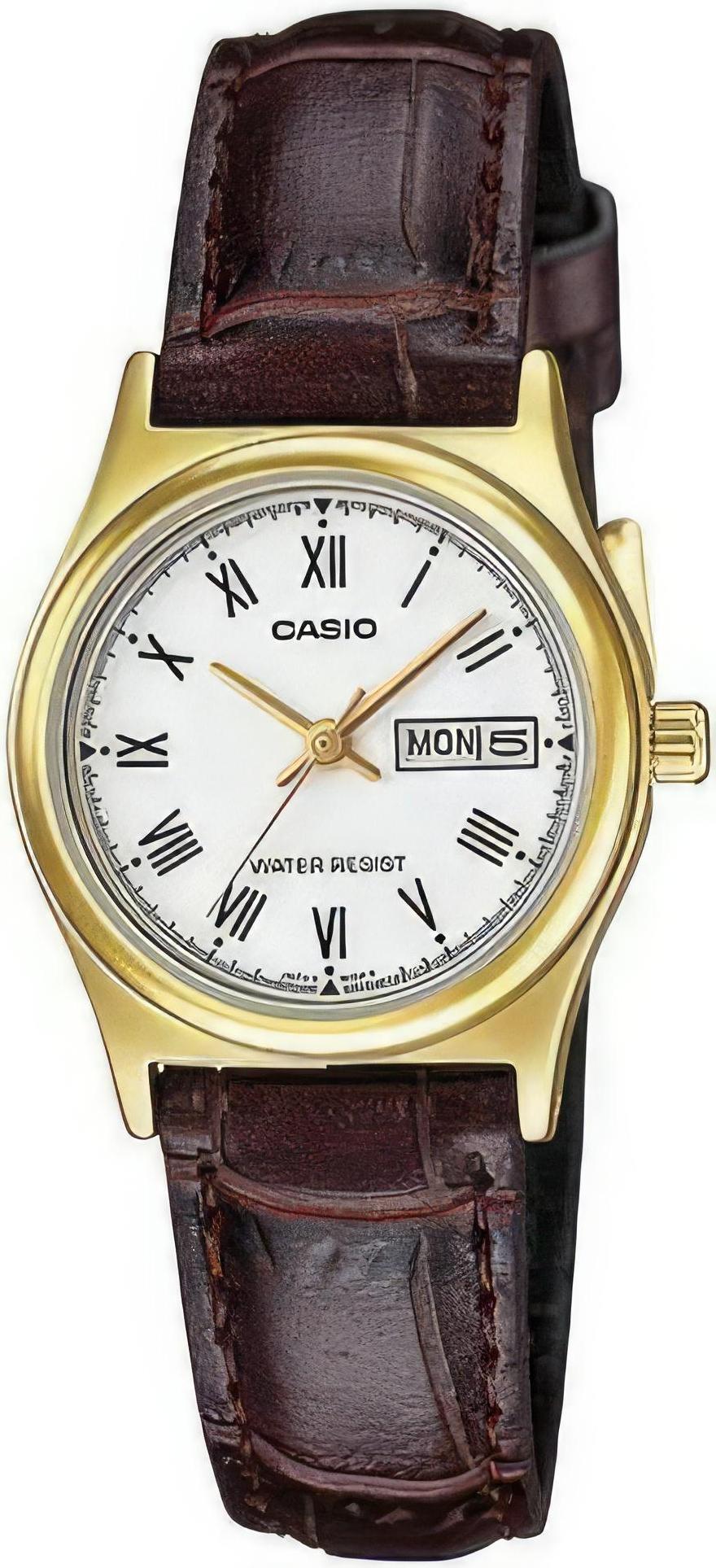 Женские наручные часы Casio Collection LTP-V006GL-7B. Точный кварцевый механизм с аналоговой индикацией. Корпус изготовлен из высококачественной нержавеющей стали 316L с высокими антикоррозийными свойствами. На циферблате отображается текущее число месяца и день недели. Ремешок изготовлен из кожи. Прочное, устойчивое к царапинам минеральное стекло защищает часы от повреждений. Часы являются водонепроницаемыми до 3 Бар. Цвет корпуса: Желтое золото. Цвет циферблата: Белый. Ширина (с заводной головкой): 25мм. Толщина: 9мм. Гарантия: 2 года.