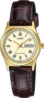 Кварцевые женские наручные часы на кожаном ремешке. Стальной корпус со стойким IP покрытием. Окошко даты и дня недели.