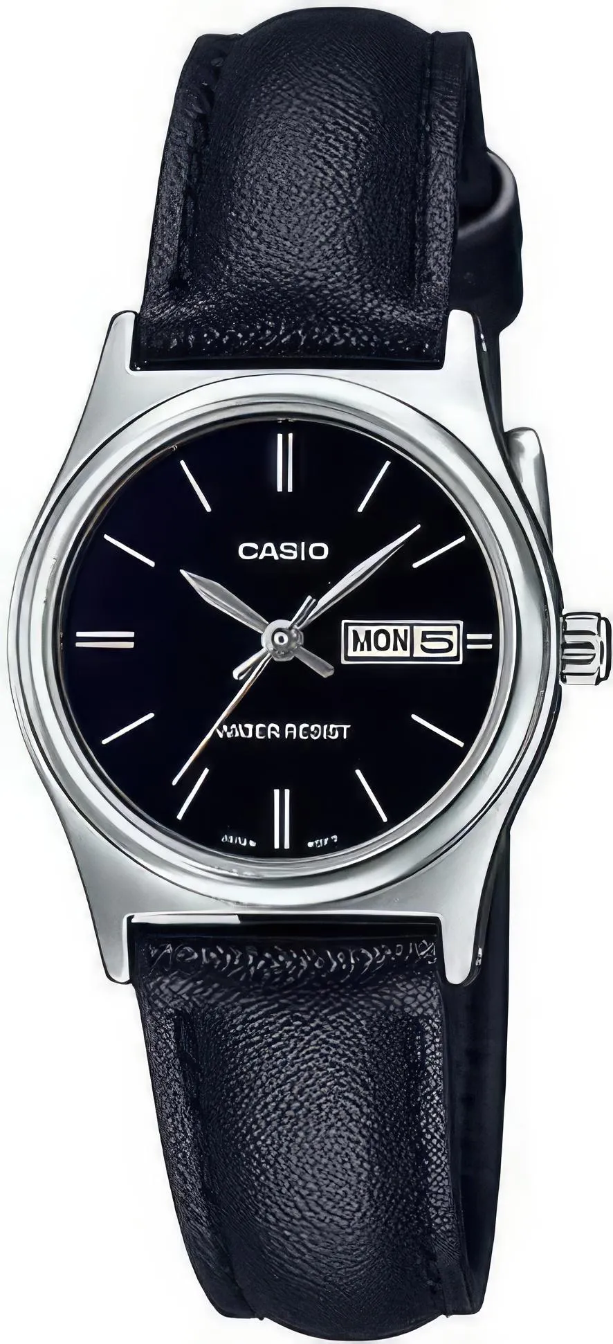 Женские наручные часы Casio Collection LTP-V006L-1B2. Точный кварцевый механизм с аналоговой индикацией. Корпус изготовлен из высококачественной нержавеющей стали 316L с высокими антикоррозийными свойствами. На циферблате отображается текущее число месяца и день недели. Ремешок изготовлен из кожи. Прочное, устойчивое к царапинам минеральное стекло защищает часы от повреждений. Часы являются водонепроницаемыми до 3 Бар. Цвет корпуса: Серебристый. Цвет циферблата: Черный. Ширина (с заводной головкой): 30мм. Толщина: 9мм. Гарантия: 2 года.