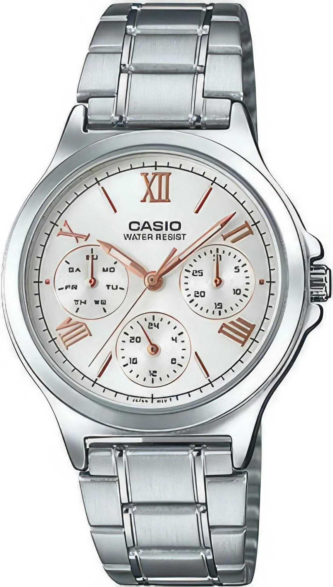 Женские наручные часы Casio Collection LTP-V300D-7A2. Точный кварцевый механизм с аналоговой индикацией. Корпус изготовлен из высококачественной нержавеющей стали 316L с высокими антикоррозийными свойствами. На стрелки и отметки нанесен светонакопительный состав, благодаря этому считывать информацию с циферблата возможно и в темноте. На циферблате отображается текущее число месяца и день недели. Браслет из нержавеющей стали. Прочное, устойчивое к царапинам минеральное стекло защищает часы от повреждений. Часы являются водонепроницаемыми до 3 Бар. Цвет корпуса: Серебристый. Цвет циферблата: Серый. Ширина (с заводной головкой): 33мм. Толщина: 8мм. Гарантия: 2 года.