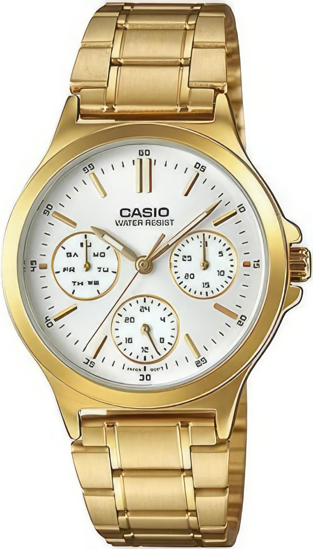 Женские часы в универсальном классическом стиле. Доступная цена. Круглый металлический корпус и стальной браслет с покрытием цвета золота. Минеральное стекло. Кварцевый механизм с дополнительными индикаторами.