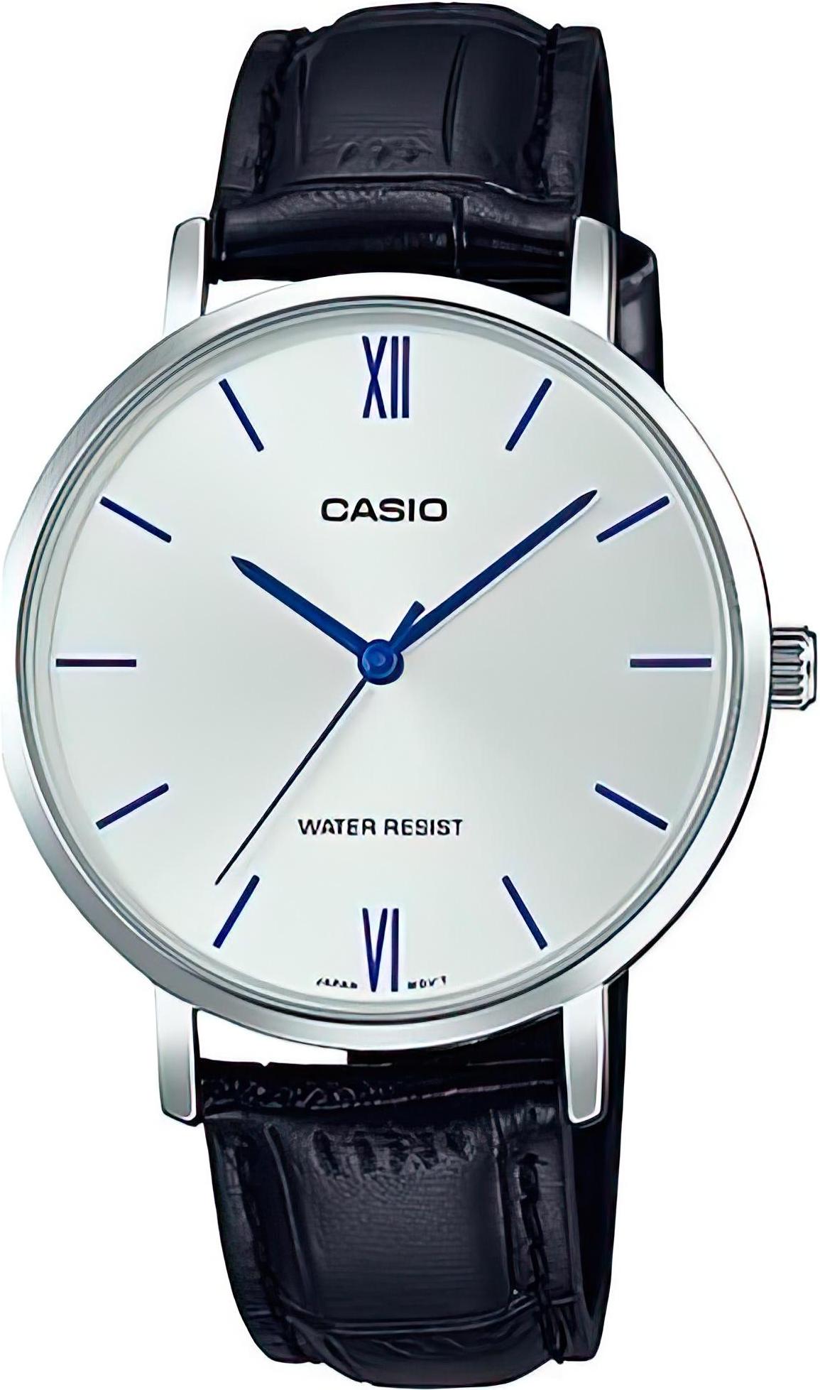 Женские наручные часы. Точный трехстрелочный кварцевый механизм. Стальной корпус круглой формы. Серебристый циферблат. Индикация римскими цифрами и индексами синего цвета. Черный кожаный ремешок с тиснением.