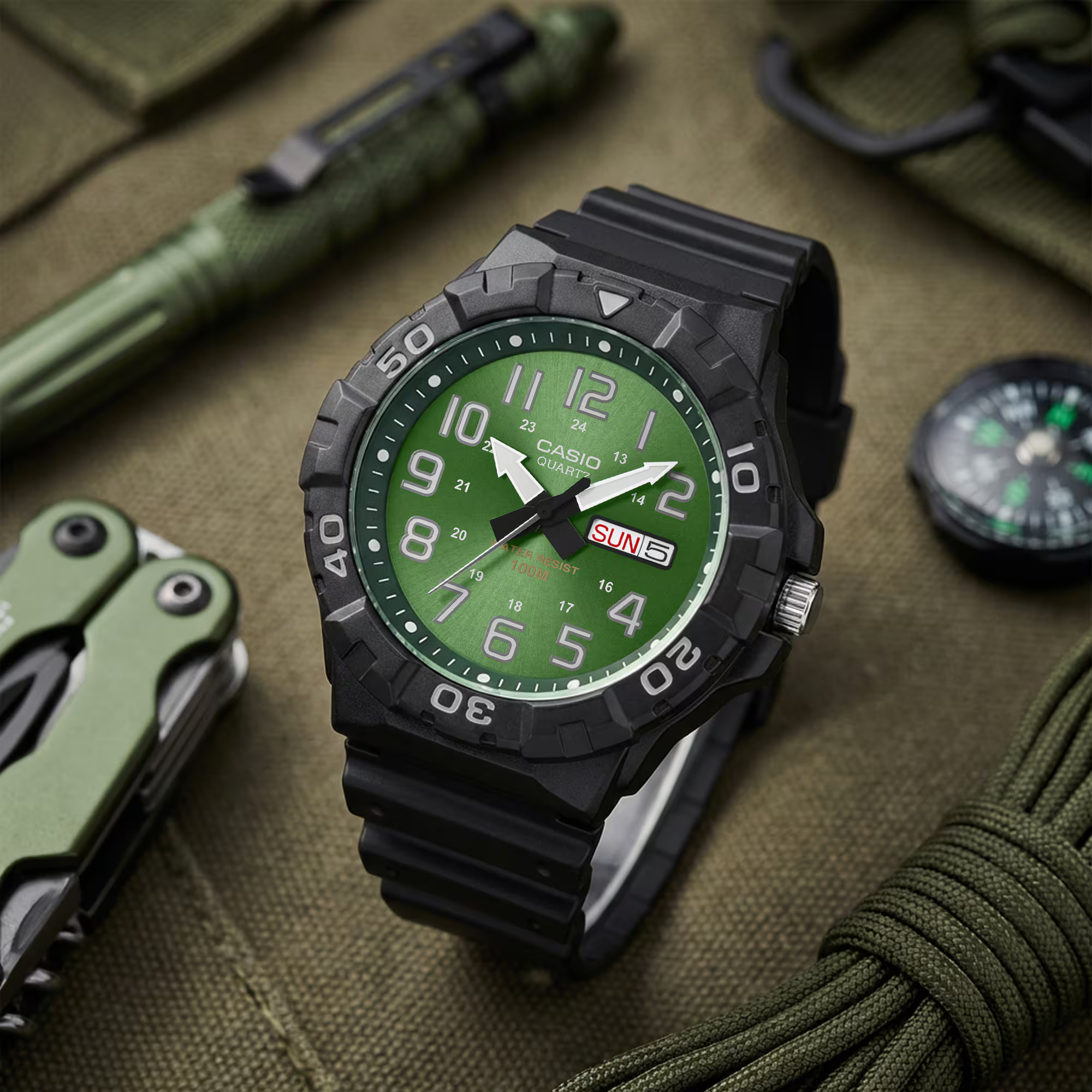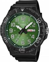 Мужские наручные часы Casio Collection MRW-210H-3B. Точный кварцевый механизм с аналоговой индикацией. В отличие от механических часов, не требуют завода и работают от батареи, показывая отклонение всего несколько секунд в месяц. Полимерный ремешок. Натуральный полимерный материал является идеальным для изготовления ремешка благодаря своей чрезвычайной прочности и гибкости. Аккумулятор обеспечивает часы достаточным питанием приблизительно на 3 года. Полимерный корпус надежно защищает часы от механических повреждений. Органическое стекло. Часы являются водонепроницаемыми до 10 Бар. Цвет корпуса: Черный. Цвет циферблата: Зеленый. Высота (с ушками): 55 мм. Толщина: 14.2 мм. Гарантия: 2 года.