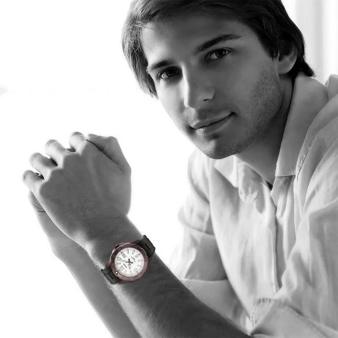 Мужские наручные часы в стальном круглом корпусе, стрелки секунд, минут и часа, окошко даты в положении 3 часа на белом циферблате.