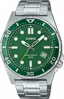 Мужские наручные часы Casio Collection MTD-135D-3A. Точный кварцевый механизм с аналоговой индикацией. Браслет из нержавеющей стали. Аккумулятор обеспечивает часы достаточным питанием приблизительно на 3 года. Браслет из нержавеющей стали. Браслет изготовлен из алюминия. Прочное, устойчивое к царапинам минеральное стекло защищает часы от повреждений. На циферблате отображается текущее число месяца. Часы являются водонепроницаемыми до 5 Бар. Цвет циферблата: Зеленый. Цвет циферблата: Серебристый. Цвет корпуса: Зеленый. На стрелки и отметки нанесен светонакопительный состав, благодаря этому считывать информацию с циферблата возможно и в темноте. Высота (с ушками): 50 мм. Толщина: 9 мм. Гарантия: 2 года.