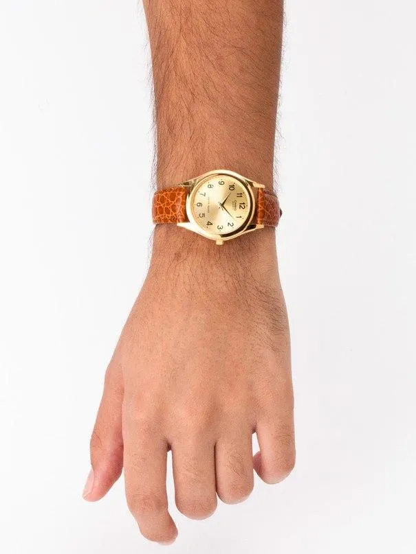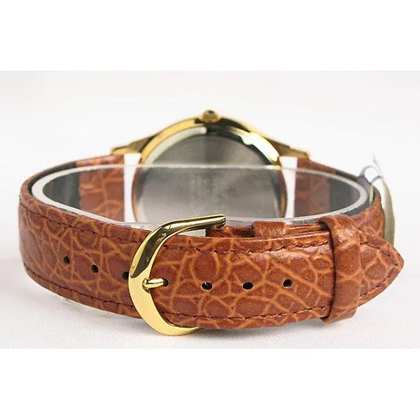 Мужские наручные часы в стальном корпусе круглой формы с позолотой, секундная стрелка центральная, на коричневом кожаном ремешке.