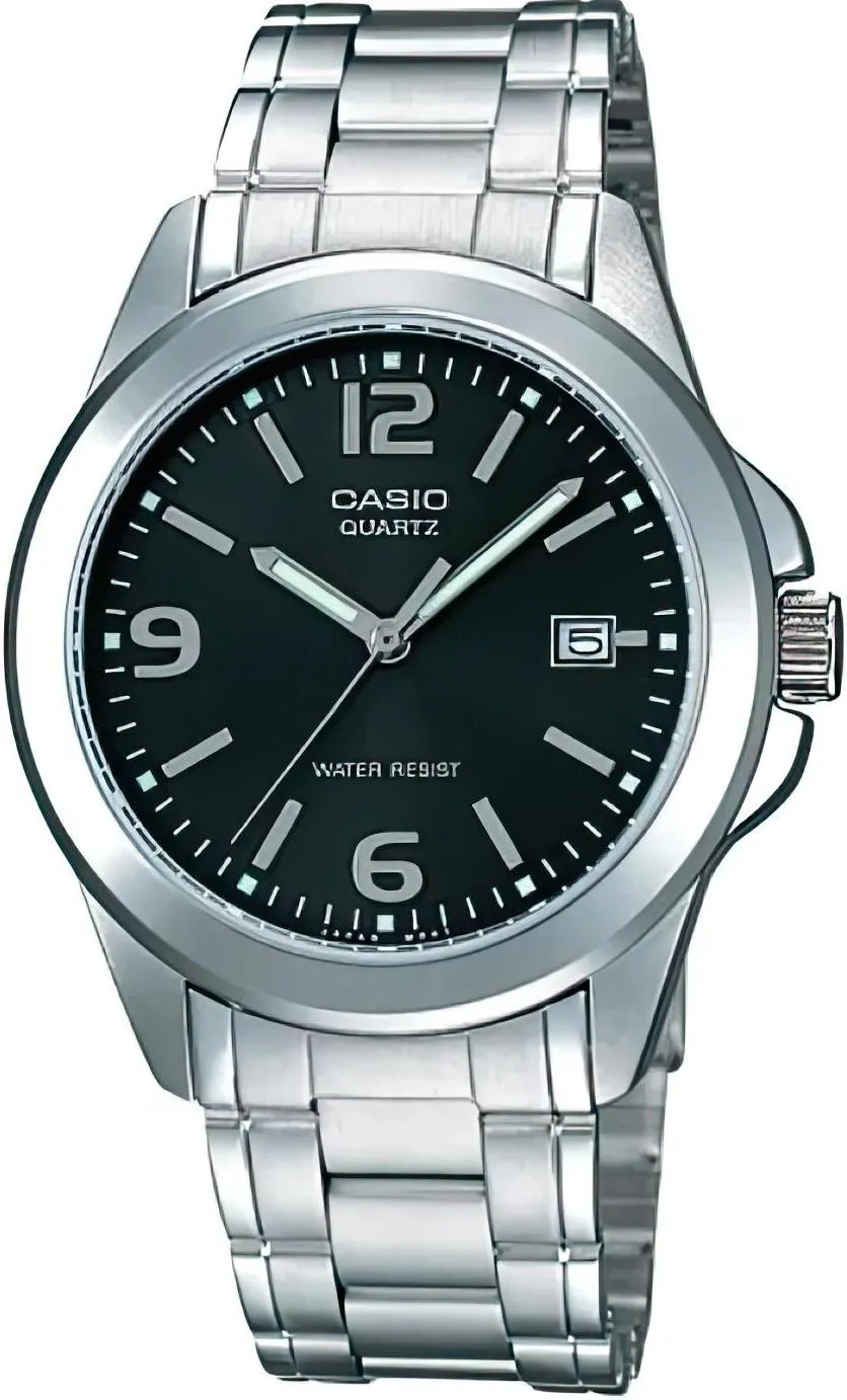 Наручные часы на стальном браслете. Окошко даты в положении 3 часа на черном циферблате.