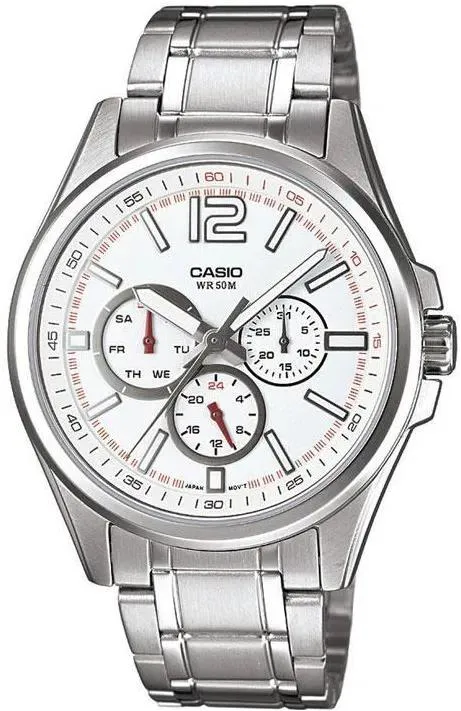 Мужские наручные часы Casio Collection MTP-1355D-7A. Точный кварцевый механизм с аналоговой индикацией. Корпус изготовлен из высококачественной нержавеющей стали 316L с высокими антикоррозийными свойствами. На стрелки и отметки нанесен светонакопительный состав, благодаря этому считывать информацию с циферблата возможно и в темноте. На циферблате отображается текущее число месяца и день недели. Браслет из нержавеющей стали. Прочное, устойчивое к царапинам минеральное стекло защищает часы от повреждений. Часы являются водонепроницаемыми до 5 Бар. Ширина (с заводной головкой): 47мм. Толщина: 9мм. Гарантия: 2 года.