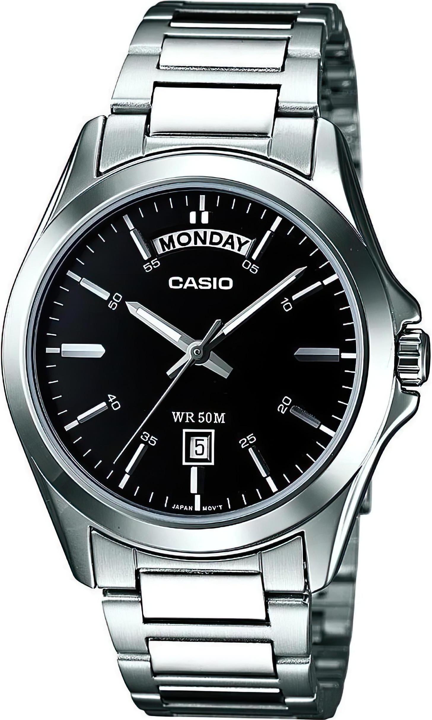 Точный кварцевый механизм. Центральная секундная стрелка. Окошко даты и дня недели. • Точность хода не хуже -10 +15 сек./в месяц. • Минеральное стекло устойчивое к возникновению царапин. • Корпус из сплава металлов с высокими антикоррозийными свойствами. • Регулируемый по длине браслет из нержавеющей стали. • Водозащита до 5 АТМ. • Светонакопительный состав на стрелках. Производитель: Япония.