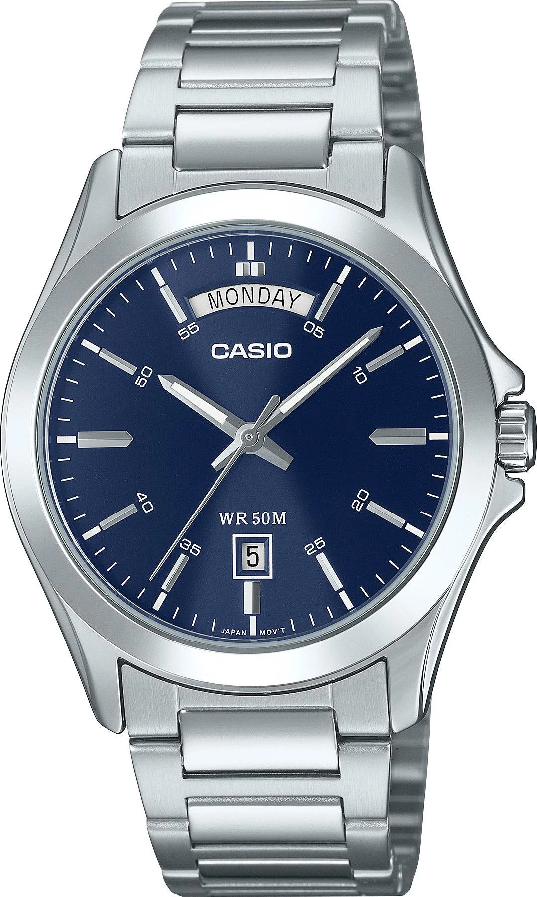 Мужские кварцевые часы Casio MTP-1370D-2A2 со стальным браслетом. Модель оснащена калибром 5336, отображает дату и день недели. Люминесцентное покрытие стрелок обеспечивает видимость в темноте. Водостойкость 50 метров (5 атм) защищает от брызг и плавания. Компактный корпус размером 45x39.8x8.8 мм и гарантия 3 года.