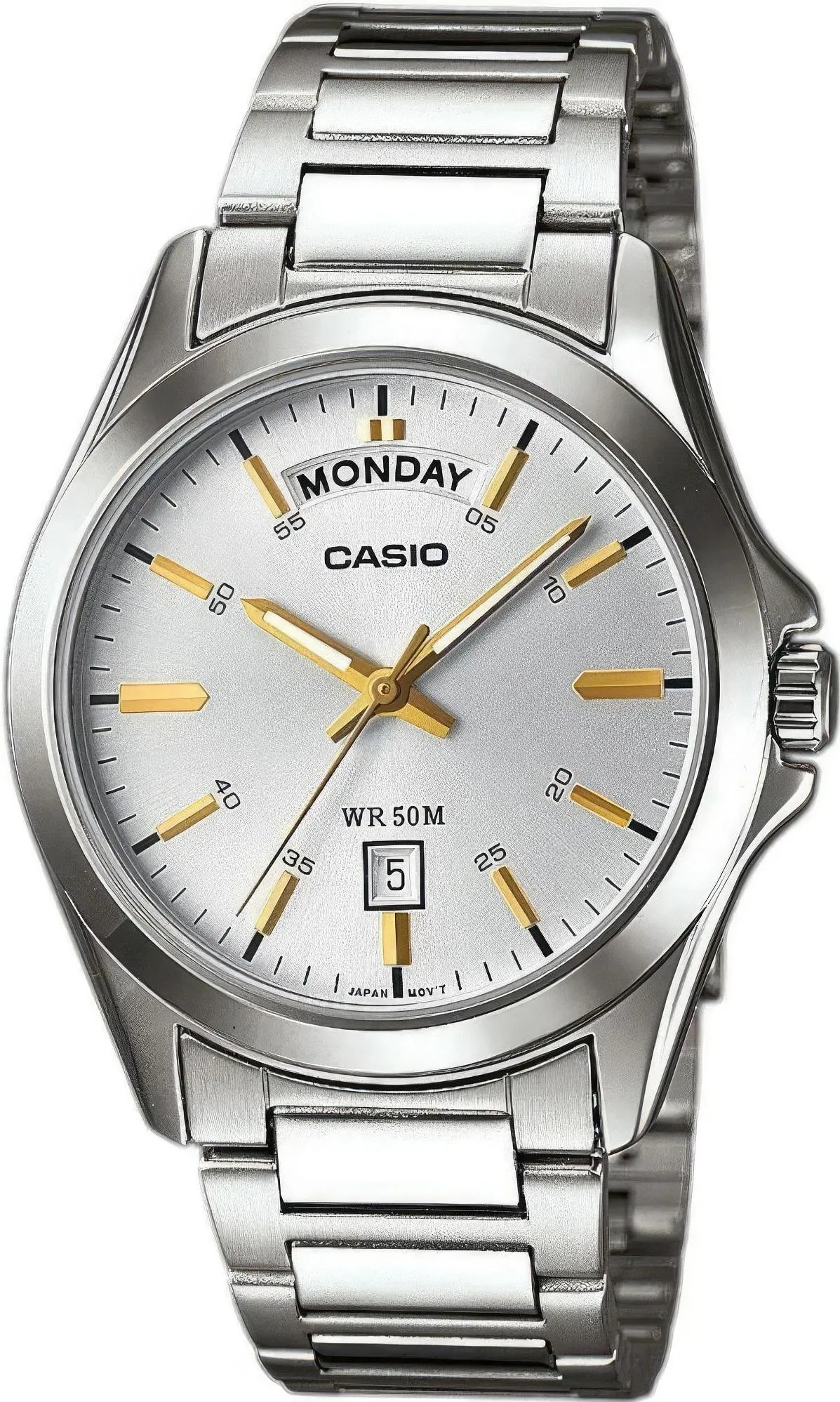 Мужские наручные часы Casio Collection MTP-1370D-7A2. Точный кварцевый механизм с аналоговой индикацией. Корпус изготовлен из высококачественной нержавеющей стали 316L с высокими антикоррозийными свойствами. На стрелки и отметки нанесен светонакопительный состав, благодаря этому считывать информацию с циферблата возможно и в темноте. На циферблате отображается текущее число месяца и день недели. Браслет из нержавеющей стали. Прочное, устойчивое к царапинам минеральное стекло защищает часы от повреждений. Часы являются водонепроницаемыми до 5 Бар. Ширина (с заводной головкой): 40мм. Толщина: 9мм. Гарантия: 2 года.